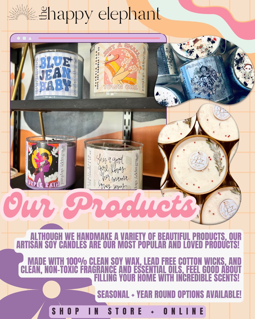 All candles + wax products are made of 100% natural soy wax, lead and zinc free cotton wicks, and clean fragrances and essential oils containing no harmful chemicals (free from all carcinogens, mutagens, and toxins that are present in almost ALL big box store candles and they are 100% phthalate-free). All products are hand designed and hand poured. Feel good about filling your home with incredible scents that also make unique, one of a kind decor pieces. Other products are also available including essential oil room sprays and roller balls, reed and car diffusers, soy wax melts, and more! Candles change seasonally and there is always something new coming soon!