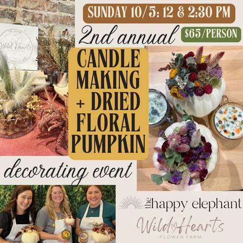 🍁DETAILS: Time to get creative! Enjoy a self guided candle making experience where you choose your own vessel, scent, and candle toppings to custom create your own fall candle. While your candle cures (1 hour), you’ll choose from a variety of home grown dried floral to hot glue onto your pumpkin. Your ticket includes all the materials and supplies to create your candle and pumpkin. Fall cocktails and mocktails will be available for purchase!